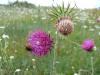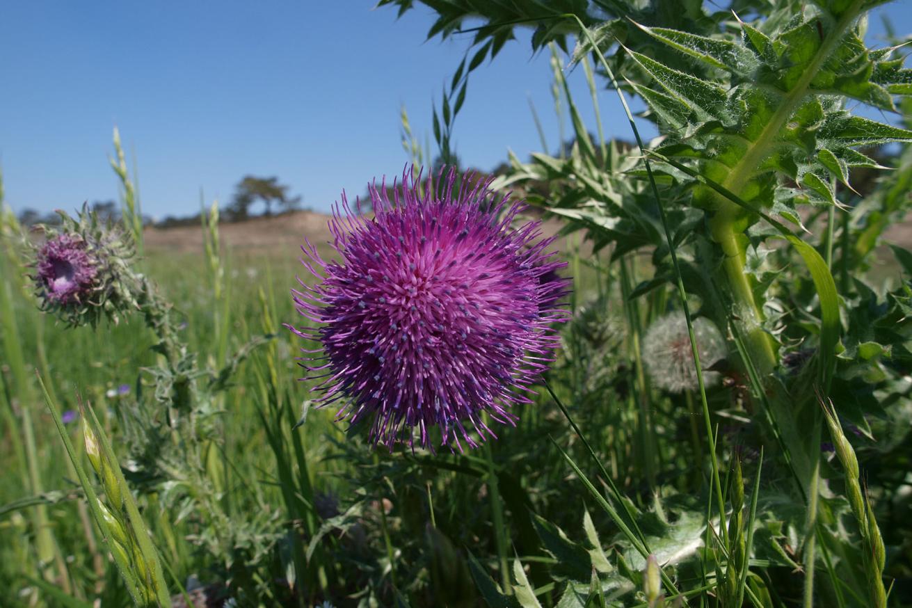 Umgangssprachlich werden diverse Gattungen der Korbblütengewächse (Asteraceae) als Disteln bezeichnet: Ringdisteln (Carduus), aber auch Kratz-, Kugel-, Esels-, Marien- und Gänsedisteln. Zu der Gattung Carduus zählen 120 z.T. schwer zu unterscheidende Arten. In Mitteleuropa ist jedoch die Nickende Distel die häufigste Art. Mit ihren derbstacheligen Fiederblättern wirkt sie sehr wehrhaft, wird aber erst mit zunehmendem Alter vom Weidevieh gemieden. Die 30 – 100 cm hoch werdende Zweijährige bildet im ersten Jahr nur eine Blattrosette und dann im zweiten Jahr reich blühende Pflanzenstiele mit hängenden, purpurfarbigen Blütenköpfen, welche süßlich duften. Die Blütezeit ist Juli bis September, nach der Fruchtbildung stirbt die Pflanze ab. Ihre flugfähigen Früchte fallen auf durch einen weißen, als Fallschirm wirkenden Haarkranz an der Spitze.