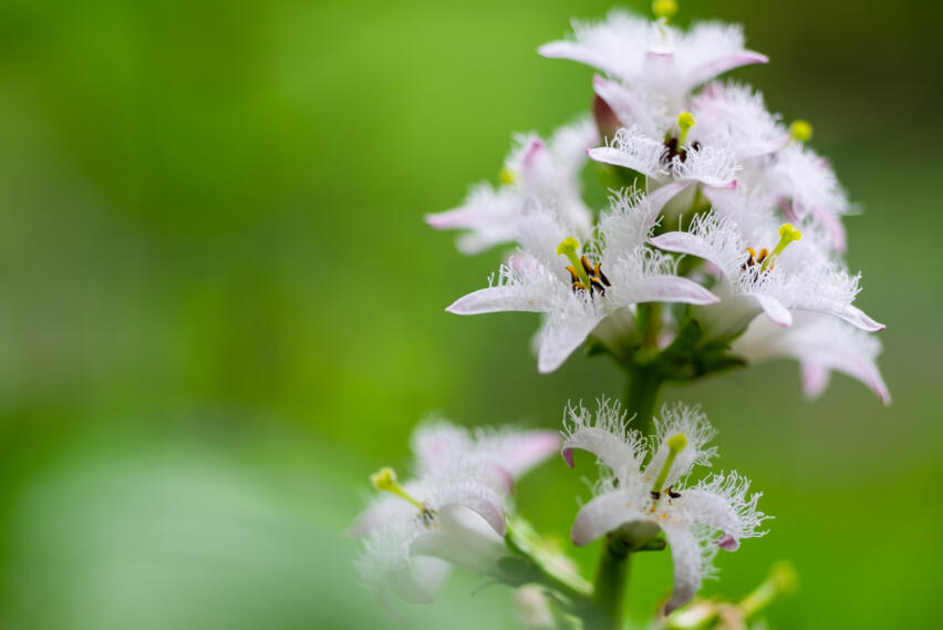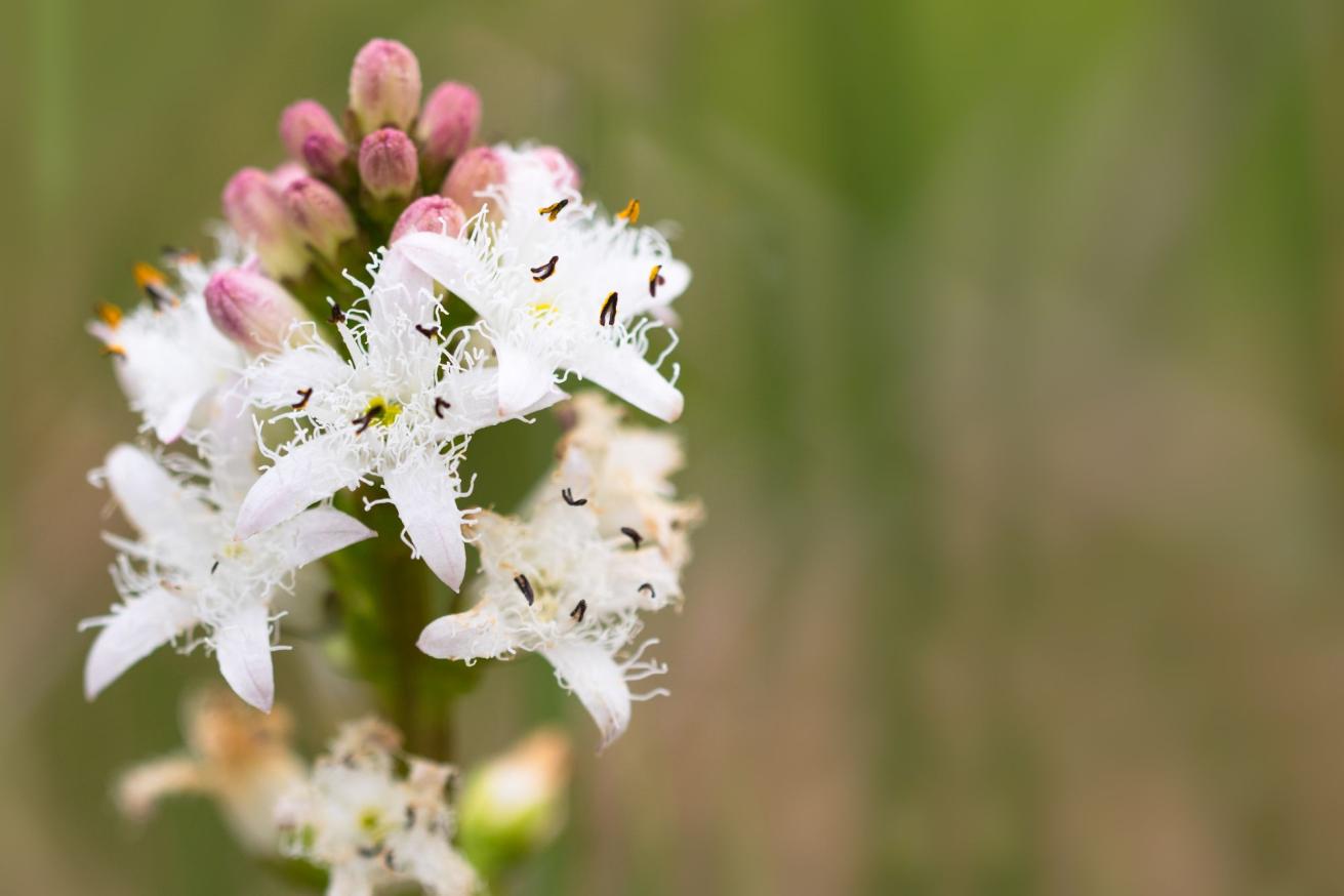 Fieberklee ist ein Multitalent und wird Naturfreunde ein Jahr lang in die Welt der Moore, Sümpfe und Feuchtwiesen führen. Denn dort ist er zuhause. Die mehrjährige Sumpfblume ist eine typische Art der Übergangsmoore und bereitet als Frühbesiedlerin in Verlandungszonen anderen Pflanzenarten den Weg. Sie ist nahezu perfekt an diese Lebensbedingungen angepasst, denn ihre hohlen Stängel und Blattstiele dienen dem Auftrieb und der Durchlüftung am Wasserstandort. Seine ganze Schönheit stellt der Fieberklee dann zwischen April und Juni zur Schau, wenn er mit seinen zarten, weißen und auffällig stark bewimperten Blüten vor allem Hummeln zu Tisch bittet.