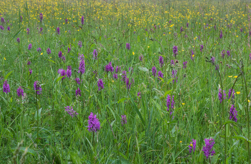 Auch in Hamburg, Niedersachsen und Mecklenburg-Vorpommern konnten wir weitere Flächen, darunter Moore und Auwald-Entwicklungsflächen, erwerben. Im Rambower Moor in Brandenburg, einem der schönsten Durchströmungsmoore Deutschlands, haben wir 12 Hektar wertvolle Moorflächen gekauft. Artenreiches, feuchtes Grünland mit Breitblättrigem Knabenkraut (Foto), Wiesenraute und Sumpf-Dotterblume zeichnen das Gebiet aus. Auch eine große Moorfroschpopulation ist hier noch zu finden, zudem ist das Rambower Moor auch ein bedeutender Rast- und Schlafplatz für Kraniche.