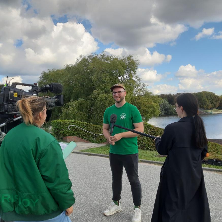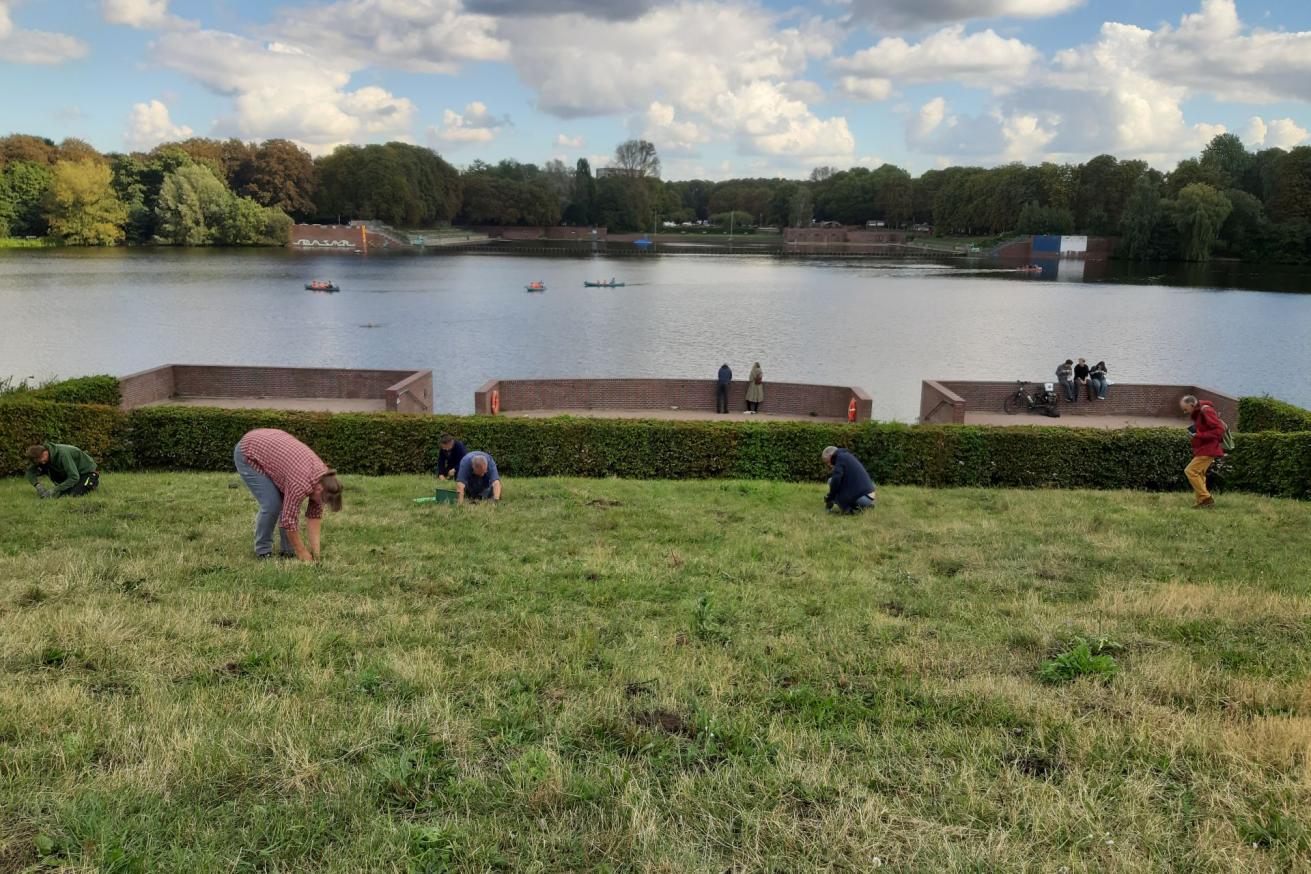 Gegen 14.30 Uhr ging es los. André Palm, Projektmitarbeiter „Blume des Jahres“ der Loki Schmidt Stiftung, begrüßte die Teilnehmenden, die sich bei kühlem, aber sonnigem Wetter an der Liegewiese am Badesee trafen. Nach einer kurzen Einweisung wurden Schaufeln und Pflanzhölzer geschwungen, schließlich galt es, 200 Grasnelken sowie Kuhschellen, Wegwarten und Kartäuser-Nelken aus dem Anzuchtgarten des Stadtparks in die Erde zu bringen. Die etwa 300 m² große Wiese ist als Standort für die farbenfroh blühenden Pflanzen besonders gut geeignet. Sie ist sonnig und der Boden trocken – ideale Bedingungen für die gepflanzten Wildblumen.