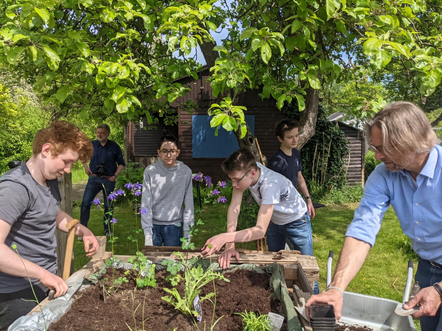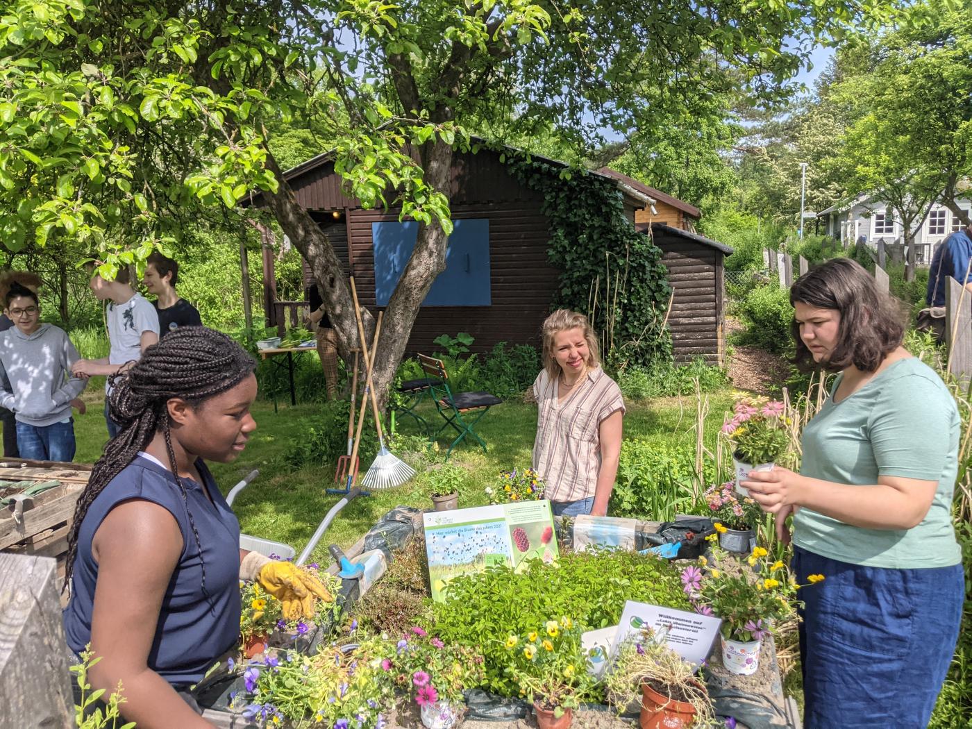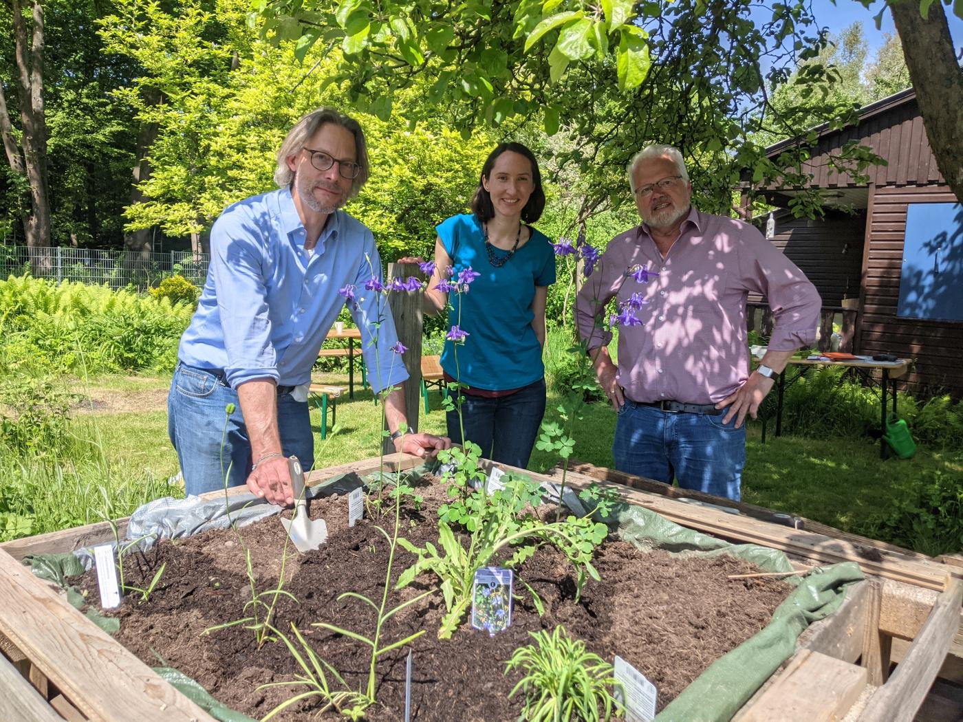 Heute pflanzten die drei Gemeinschaftsgärten gemeinsam mit der Loki Schmidt Stiftung weitere vier Wildpflanzenarten im Garten, die in der Vergangenheit zur Blume des Jahres gekürt wurden. Mit von der Partie waren der Initiator von „Lokis Blumenwiese“, Bernd Tißler, die Mitarbeiterin der Loki Schmidt Stiftung, Svenja Holst, die Lehrerin der Reformschule Winterhude, Sarah Leinkauf, mit ihren Schülern sowie vom Kitaträger „Kinderwelt Hamburg e.V.“, Jochen Blauel.