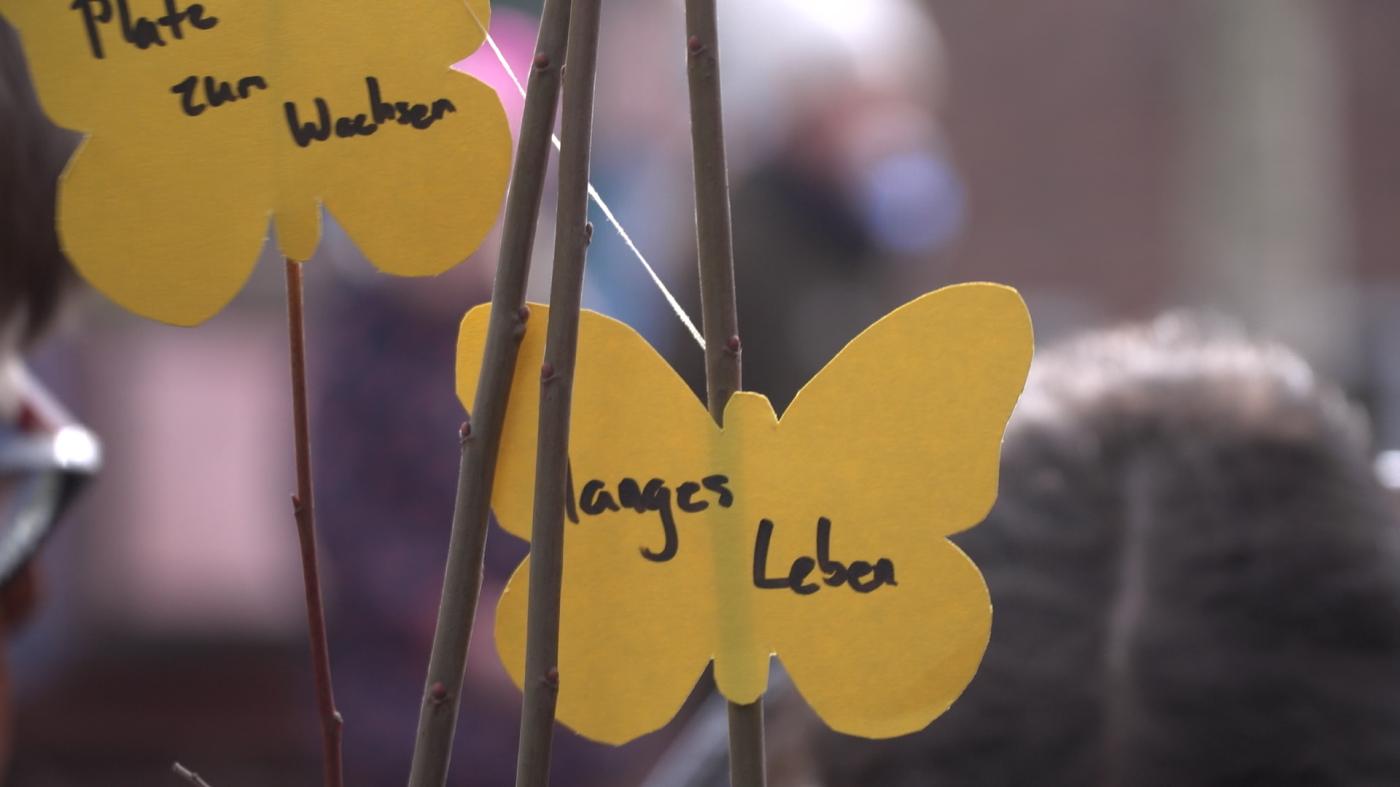 Beim Pflanzfest hängen die Kinder ihre Wünsche für den Baum in Form von Papierschmetterlingen an die Zweige. – Foto: Loki Schmidt Stiftung