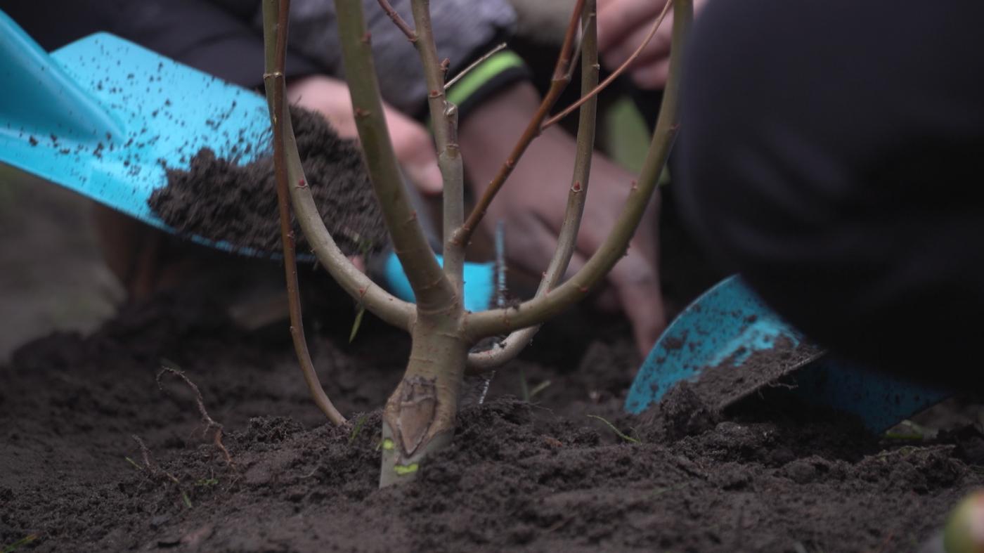 Hier packen alle mit an: Gemeinsam mit den Kindern wird die Sal-Weide auf dem Schulhof gepflanzt. – Foto: Loki Schmidt Stiftung