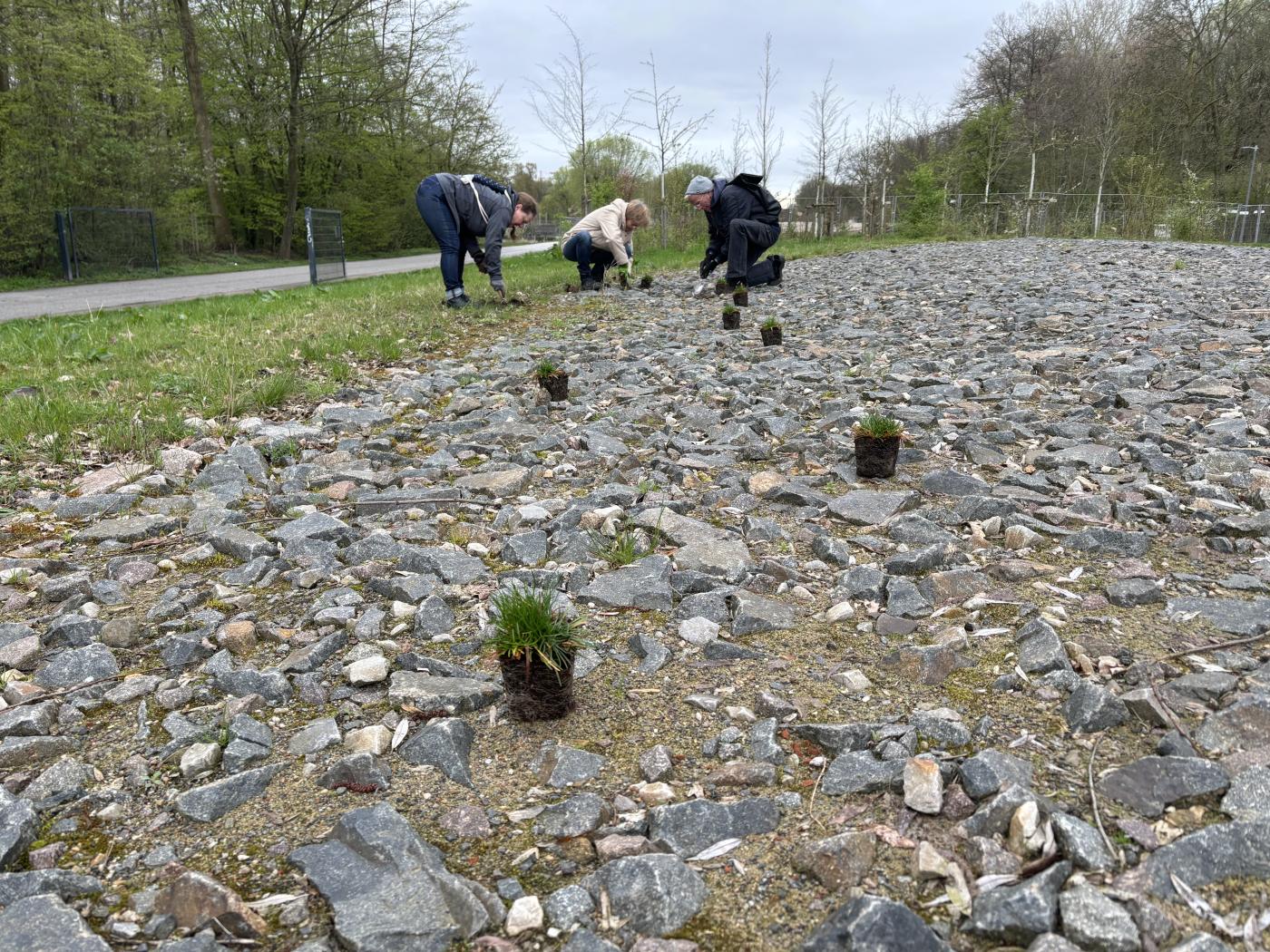 Dass die Grasnelke im Wilhelmsburger Inselpark ein neues Zuhause gefunden hat, ist nicht nur den Mitarbeitenden der Loki Schmidt Stiftung und des Wilhelmsburger Inselparks zu verdanken, sondern auch den ehrenamtlichen Helfer*innen, die am 4. April 2024 zu Schaufel und Pflanzholz griffen. 48 Grasnelken setzten sie gemeinsam in den sandigen, steinigen Boden.