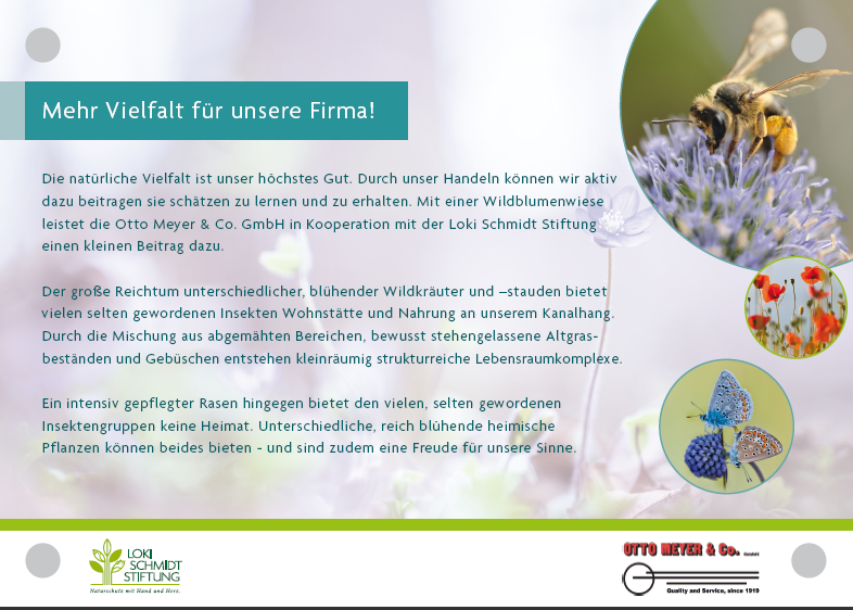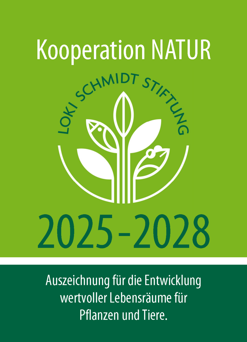 Mit dem ‚Kooperation NATUR‘-Siegel der Loki Schmidt Stiftung wird das Engagement und Commitment zu Natur- und Umweltschutzprojekten auf dem Firmengelände gewürdigt. Das Siegel kann unabhängig von der Begleitung durch die Loki Schmidt Stiftung vergeben werden.