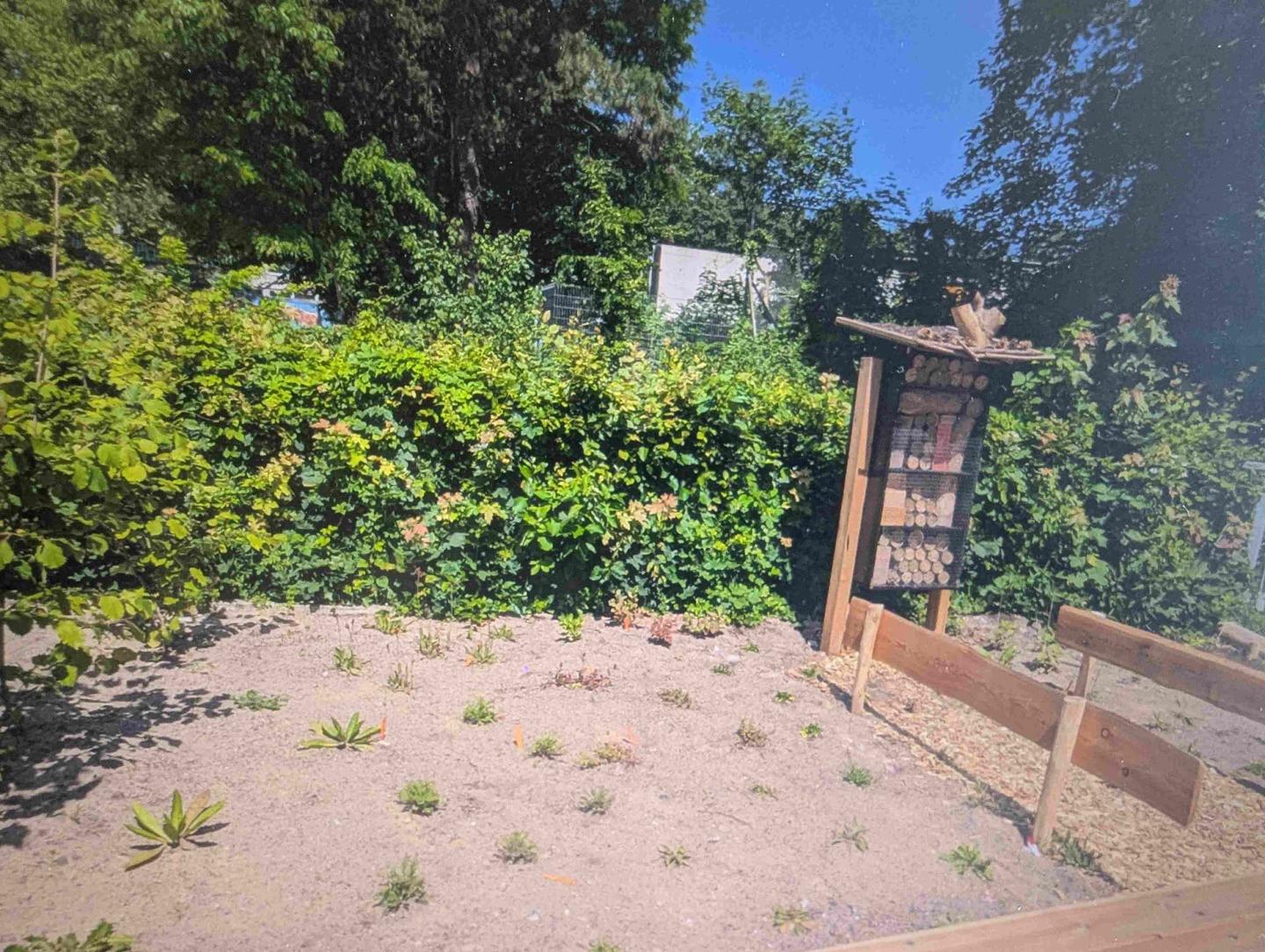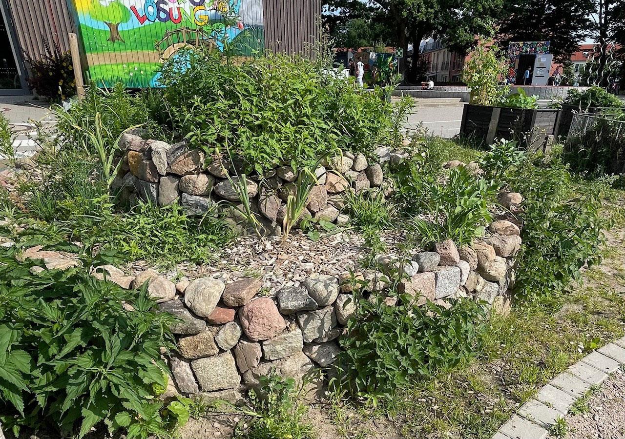 Projektbeschreibung: Um ihren Schulhof grüner, artenreicher und tierfreundlicher zu gestalten, haben Schüler*innen der Klassen 5 bis 12 gemeinsam mit Lehrkräften zwei bisher von Efeu bedeckte Beete auf 75?m² umgestaltet. Dabei entfernten sie die alten Bodendecker, pflanzten heimische Stauden und Gehölze und integrierten Totholz sowie eine Trockenmauer als Lebensräume für Tiere. Besonders ist, dass viele Beteiligte ihre Nachmittage freiwillig für das Projekt investierten – mit großem Einsatz und echter Begeisterung.