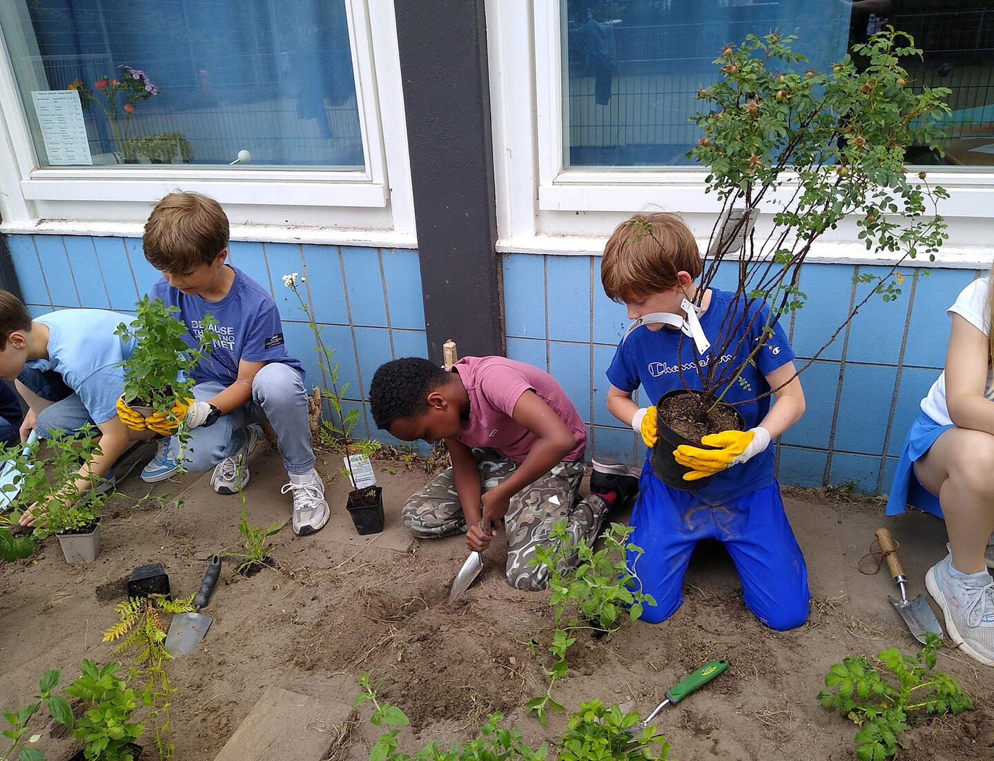 Mit viel Kreativität und Nachhaltigkeit hat die Schule Wildblumenbeete und ein großes Insektenhotel angelegt – inklusive der Produktion von Löwenzahnhonig, Saatgutgewinnung und Pflanzschildern aus Altholz. Höhepunkt war das gemeinsame Einpflanzen einer Salweide als Symbol für Artenvielfalt. In wöchentlichen Schulgartenpausen, einem Wahlpflichtkurs und an Projekttagen kümmern sich die Kinder selbst um Pflege und Ernte.