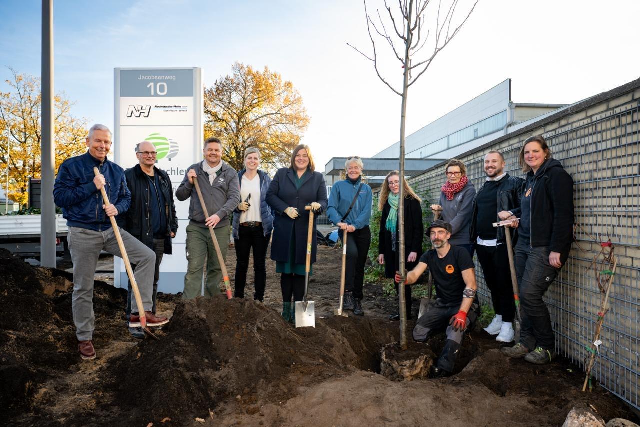 Auch zwischen Hallen, Parkplätzen und Bürogebäuden können wertvolle Lebensräume entstehen. Davon profitieren Klima und Natur sowie Beschäftigte, wie ein Biodiversitäts-Projekt auf dem Gelände der Firma „Die Elbtischler“ in Stellingen zeigt. Umweltsenatorin Katharina Fegebank setzte am 6.11.2025 gemeinsam mit den Projektpartnern und dem Kooperationspartner der Loki Schmidt Stiftung den ersten Spatenstich und pflanzte eine Weinrebe der Sorte „Katharina“. Firmen können sich bei vielen Biodiversitäts-Projekten durch ein KfW-Förderprogramm unterstützen lassen und bekommen günstige Darlehen oder Zuschüsse – so wie auch dieses Projekt.