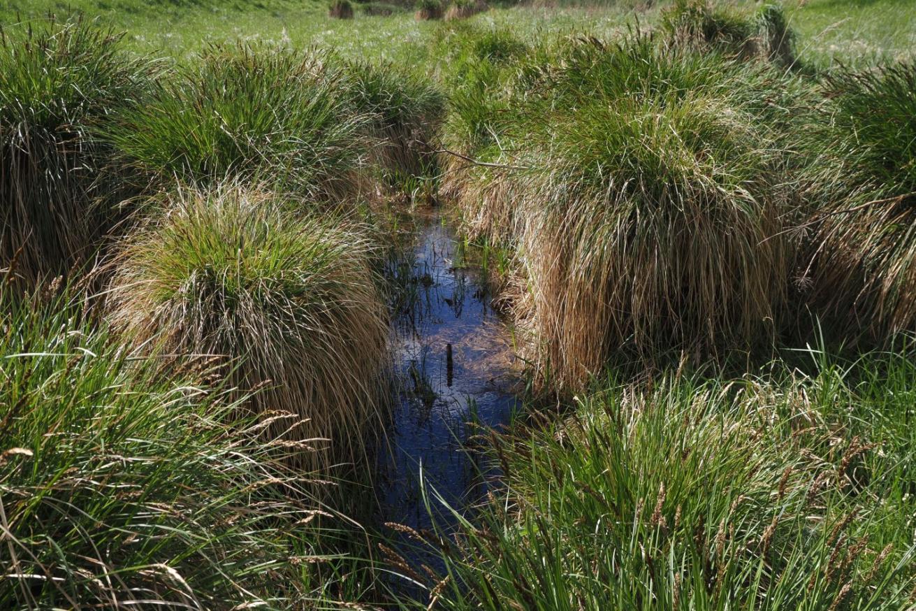 Unmittelbar an der polnischen Grenze, wo diese den Neuwarper See (eine Bucht des Stettiner Haffs) erreicht, liegt versteckt unsere seggenreiche Nasswiese. Hier blühen das Fleischfarbene und das Breitblättrige Knabenkraut, Schlangenknöterich, Schmalblättriges Wollgras und Fieberklee.