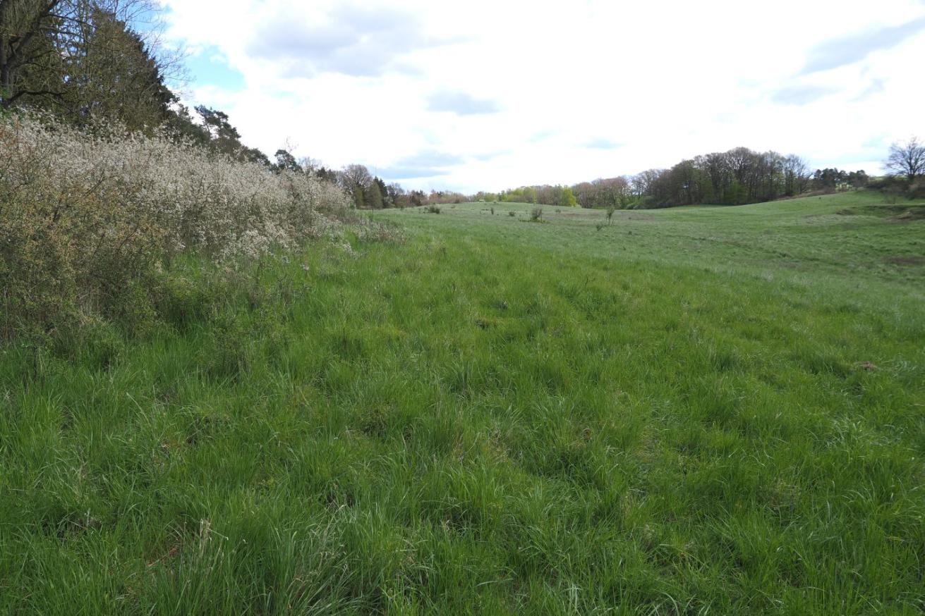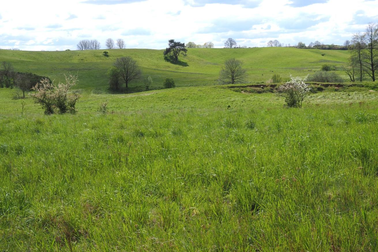 Bei Goritz, unweit der Recknitz im Landkreis Rostock, konnte die Stiftung ein großes, hügeliges, von Gehölzen eingefasstes Grünland erwerben.